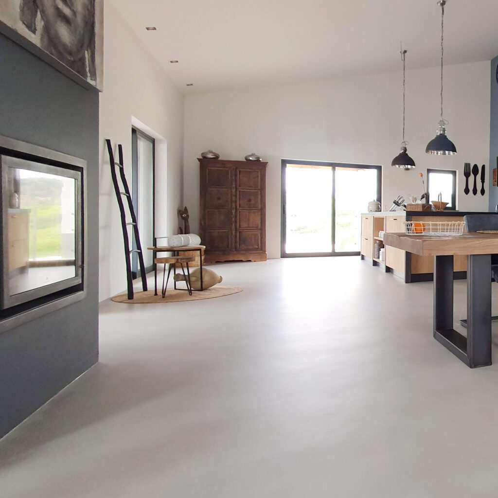 Mikrosement på et kjøkkengulv gir et sømløst og moderne utseende. Overflaten blir robust med muligheter for mange fargevalg.
